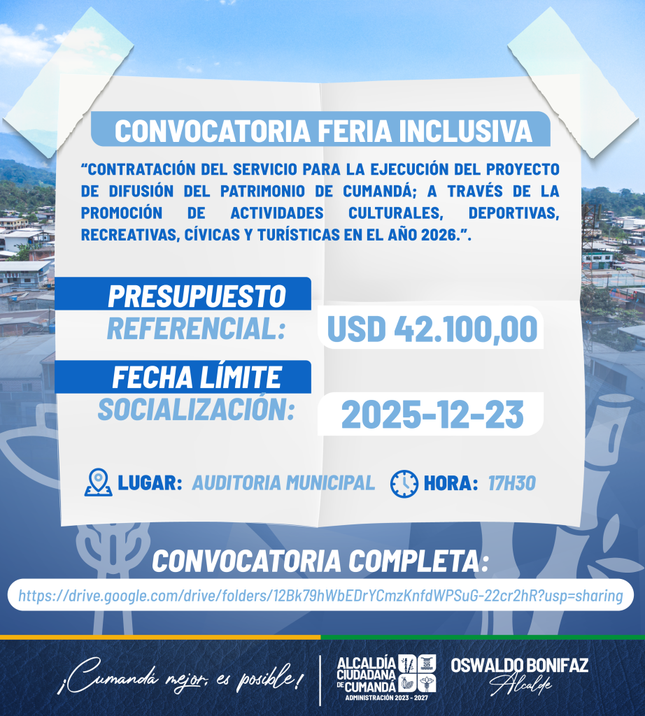 El Gobierno Autónomo Descentralizado Municipal del cantón Cumandá convoca a todas las personas naturales o jurídicas, que estén habilitados en el Registro Único de Proveedores RUP y domiciliadas en el cantón Cumandá, para la presentación de ofertas relacionadas con la “CONTRATACIÓN DEL PROYECTO DE FORTALECIMIENTO DE LAS MANIFESTACIONES CULTURALES A TRAVÉS DE LA DIFUSIÓN DEL PATRIMONIO NATURAL Y CULTURAL EN LA FERIA DE TURISMO “CUMANDÁ MEJOR, ES POSIBLE, 2024”, siempre y cuando cumplan con los documentos habilitantes:
