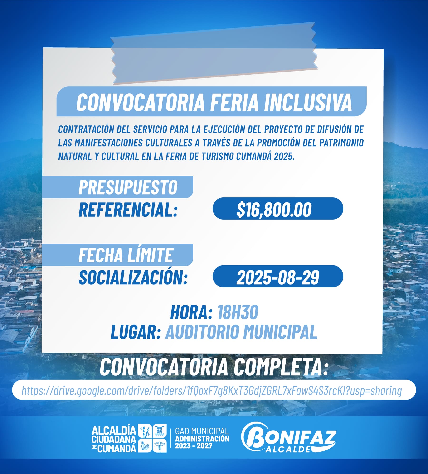 El Gobierno Autónomo Descentralizado Municipal del cantón Cumandá convoca a todas las personas naturales o jurídicas, que estén habilitados en el Registro Único de Proveedores RUP y domiciliadas en el cantón Cumandá, para la presentación de ofertas relacionadas con la “CONTRATACIÓN DEL PROYECTO DE FORTALECIMIENTO DE LAS MANIFESTACIONES CULTURALES A TRAVÉS DE LA DIFUSIÓN DEL PATRIMONIO NATURAL Y CULTURAL EN LA FERIA DE TURISMO “CUMANDÁ MEJOR, ES POSIBLE, 2024”, siempre y cuando cumplan con los documentos habilitantes: